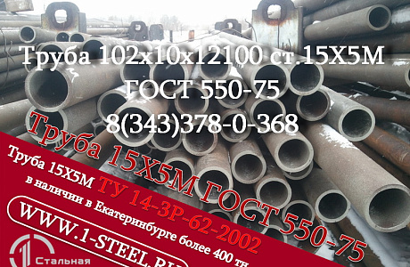 Также более 500 типоразмеров труб ст. 15Х5М по ГОСТ 550-75 и ТУ 14-3Р 62-2002 из наличия в Екатеринбурге.<br />